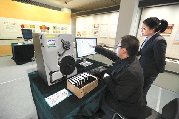 全國(guó)圖書館文獻(xiàn)縮微復(fù)制中心工作人員演示漢龍公司縮微設(shè)備
